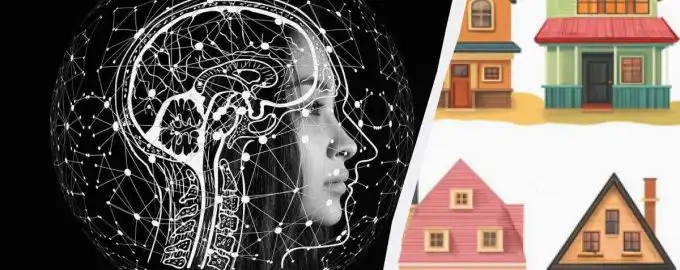 Du kan hamna i en ”fälla” när du utför uppgiften. Behöver du hitta en tupp bland husen / collage med foto pixabay.com och Moje Visuella gåtor för vuxna.