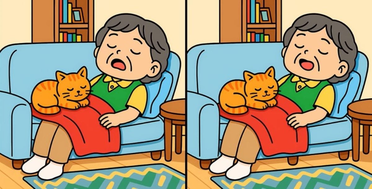 Är du redo att testa dig själv? Här är två illustrationer: de visar en kvinna och en katt som sover på en soffa. Vid första anblicken ser scenerna exakt likadana ut, men det finns tre små skillnader mellan dem.