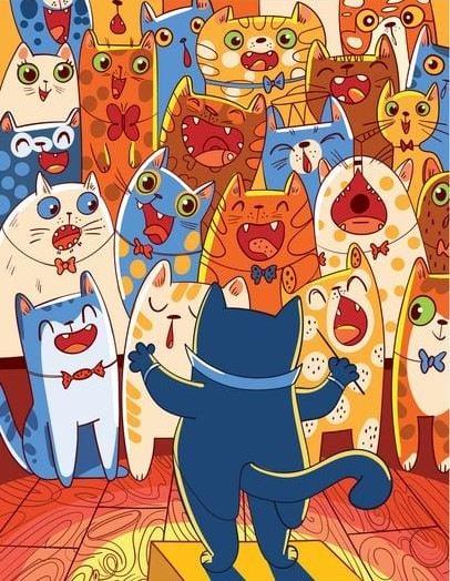 På pusselbilden ser du en grupp katter som sjunger i kör. Den grå katten i förgrunden är körens ledare och de andra katterna följer honom. Katterna förbereder sig för en körtävling och behöver all energi de kan få. Katten som är kördirigent har köpt fisk till sin grupp. Tyvärr har en av de giriga katterna ätit upp alla fiskarna och det finns bara en fisk kvar. Kan du hitta den gömda fisken i kören på 12 sekunder?