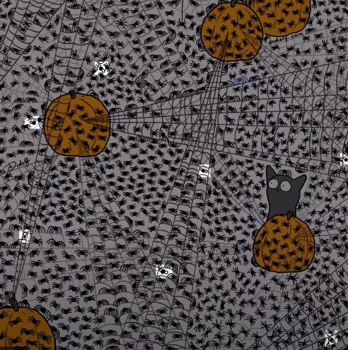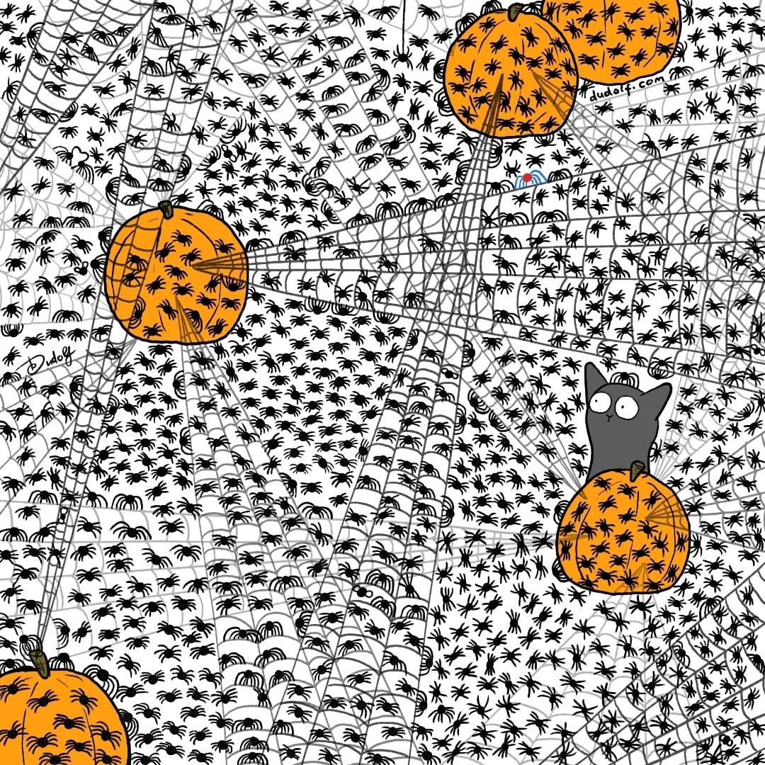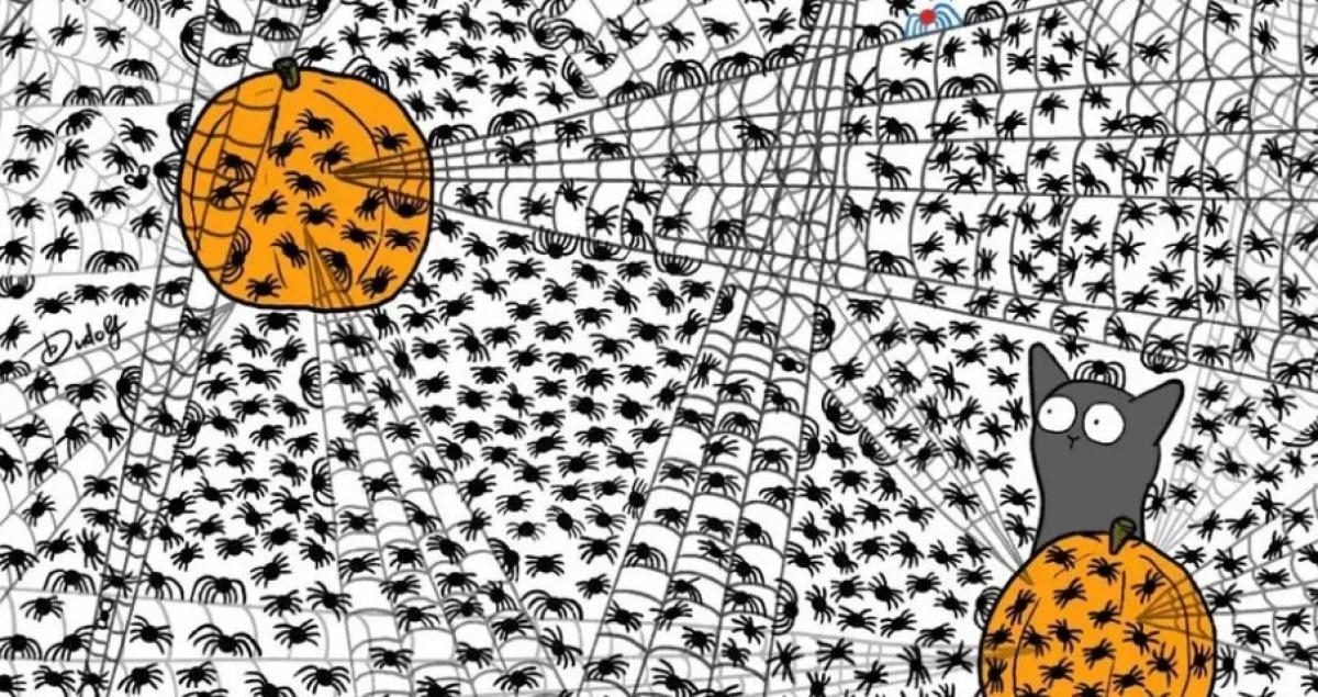 Försök att lösa ett pussel som har blivit otroligt populärt på Internet – du måste snabbt hitta flugor i en bild med pumpor och massor av spindlar.