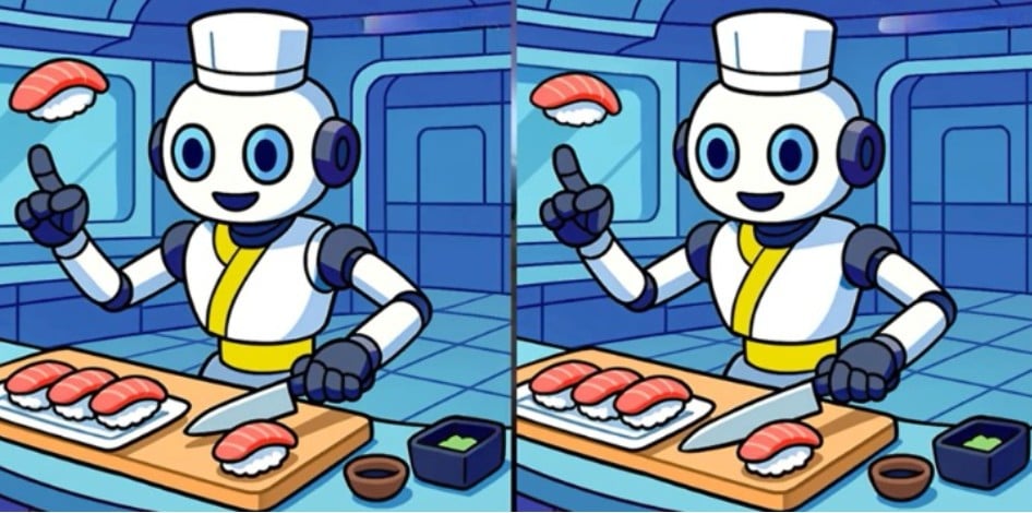 Bilderna som visas här föreställer en sushi-robot. Vid första anblicken ser de två bilderna exakt likadana ut, men det finns tre små skillnader mellan dem.