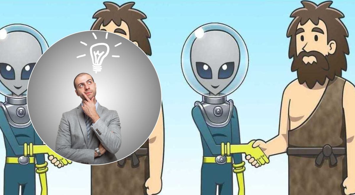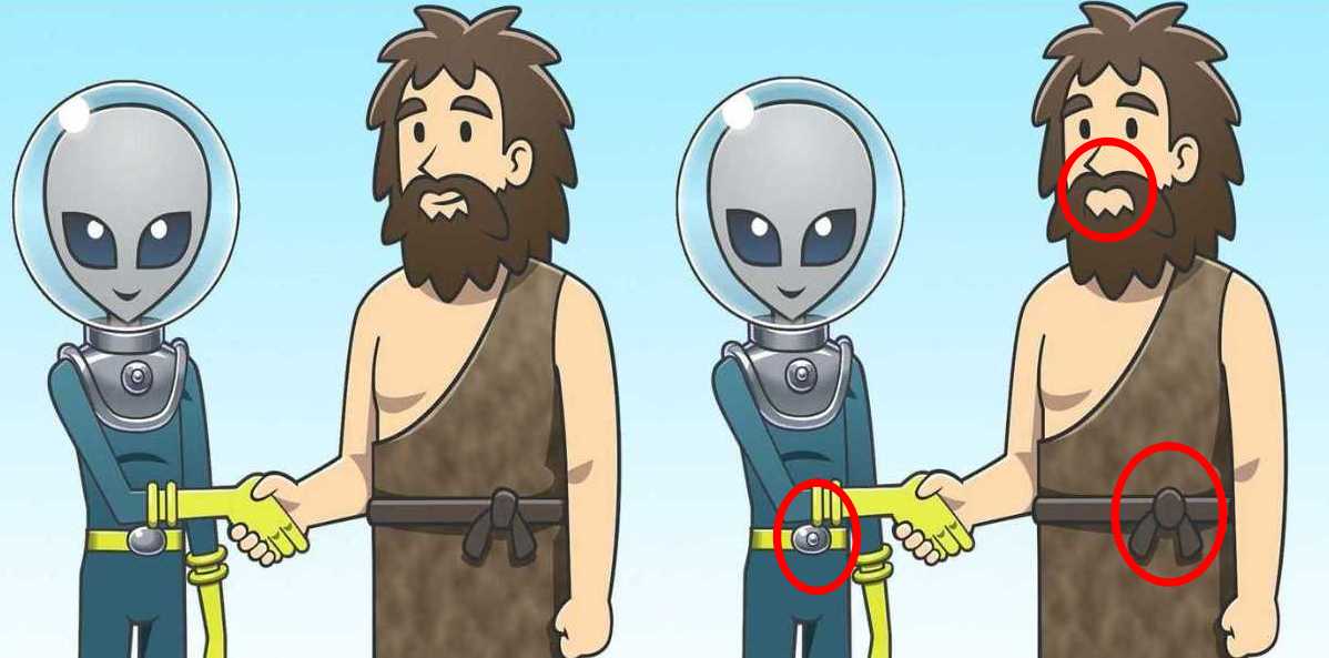 I den presenterade bilden kan du märka två identiska utomjordingar och två grottmänniskor.