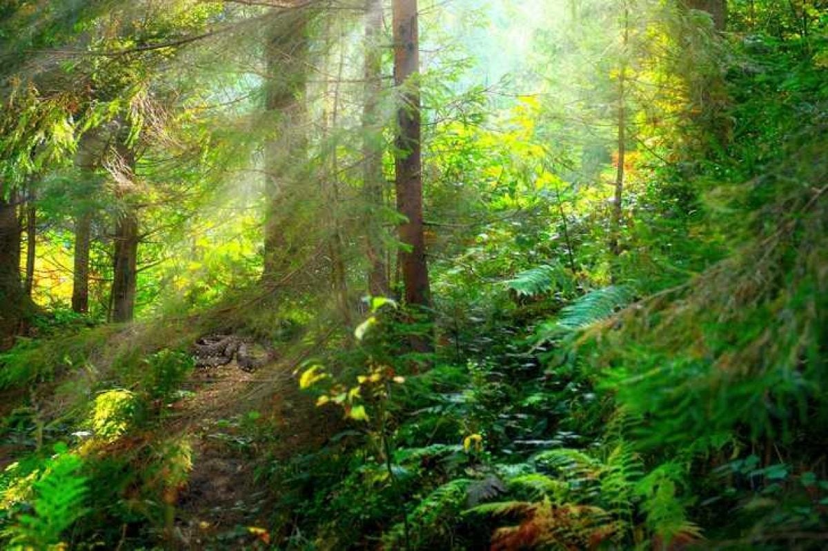 Bilden visar en tät grön skog. Någonstans gömmer sig en orm, som vi måste hitta.