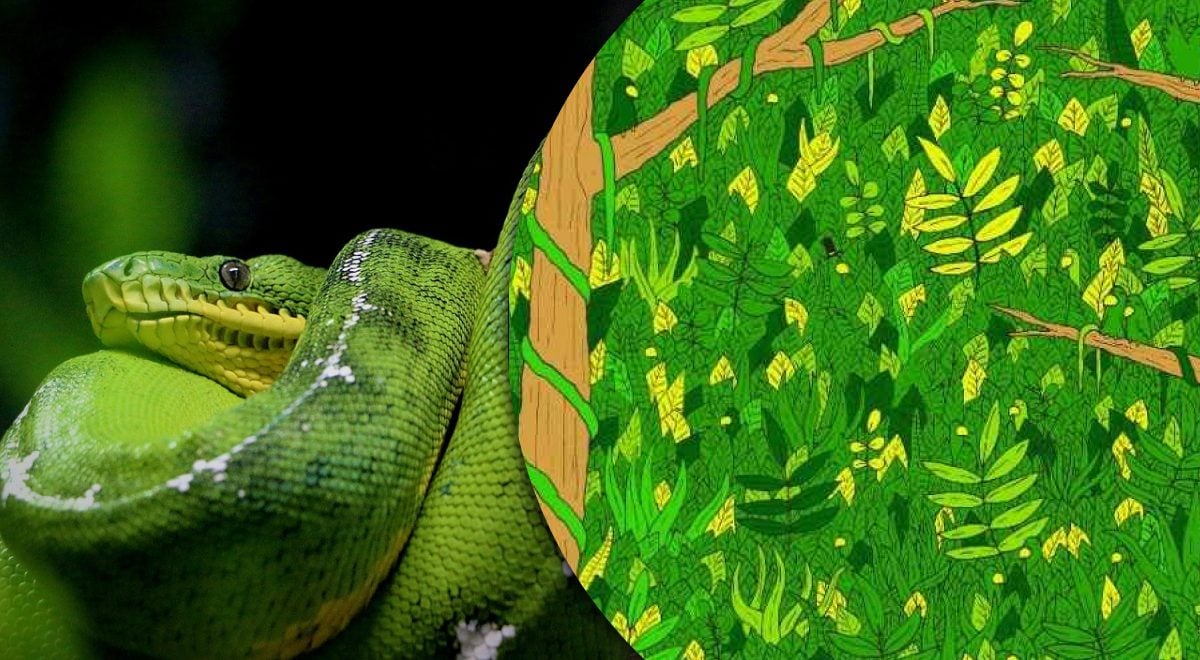 Uppgiften verkar enkel, men i själva verket är den svår, eftersom ormen är kamouflerad bland det täta lövverket.