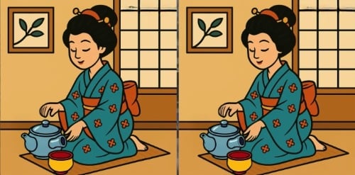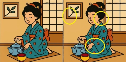 Du ställs inför en klassisk uppgift: två bilder av en kinesisk kvinna med en kopp te ser identiska ut, men i själva verket finns det tre små skillnader mellan dem. Det kan handla om färg, form eller hur detaljerna är arrangerade.