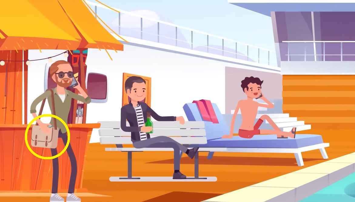 Tjuven är killen med glasögon eftersom han stjäl bestick från buffén vid poolen.