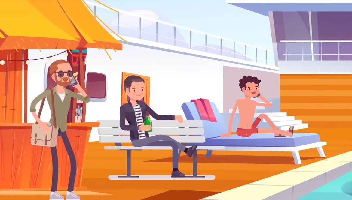 Var och en av killarna är upptagen med att göra sin egen grej – några pratar i telefon och andra njuter bara av en lugn stund vid poolen med en drink i handen.