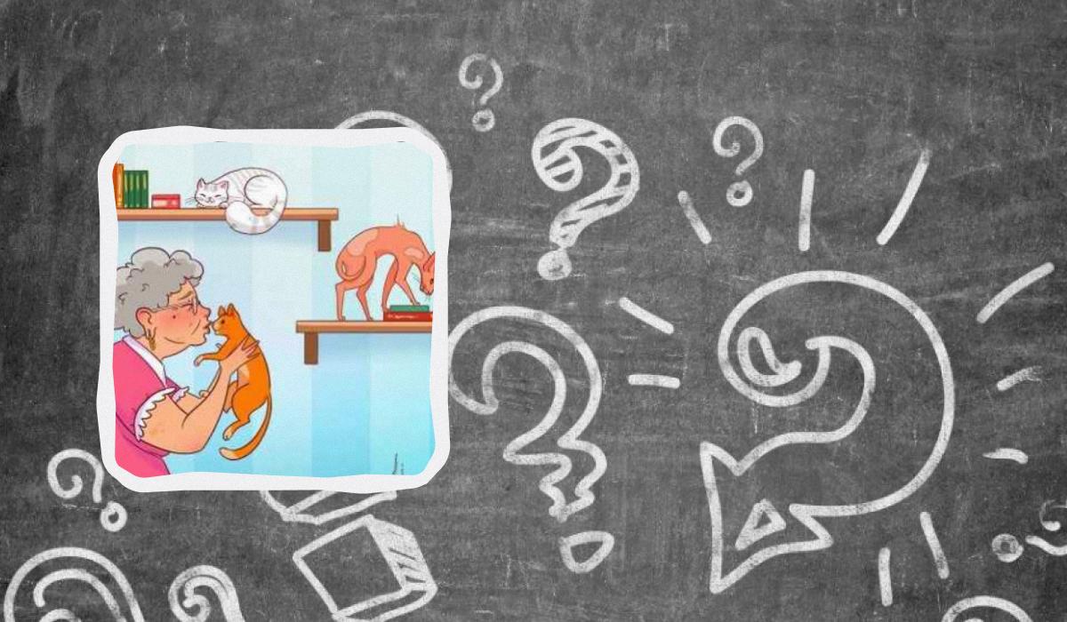 Bilden visar en pensionär som är omgiven av husdjur. Katter och katter av olika raser leker och vilar i rummet. Det kan tyckas att det inte finns något överflödigt i bilden, men så är det inte – konstnären har gömt inkonsekvensen här.