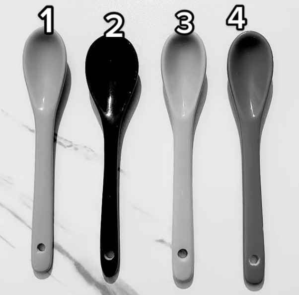 På bilden ser vi fyra skedar, som utan tvekan har olika färger. Men mättnaden har tagits bort från bilden, vilket gör det svårt att omedelbart förstå vilken färg vart och ett av dessa enskilda föremål har.
