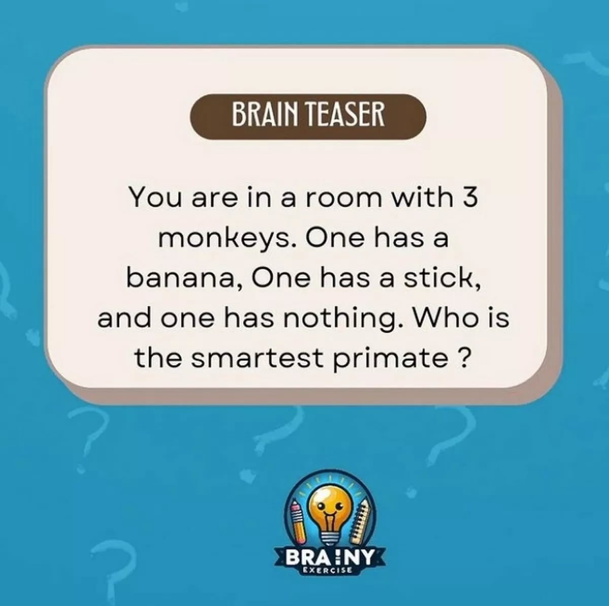 The Mirror har publicerat en av dem, med bara 30 sekunder på sig att lösa, och gåtan lyder så här: ”Det finns tre apor i ett rum. Den första har en banan, den andra har en pinne och den tredje har ingenting. Vem är den mest intelligenta primaten?”