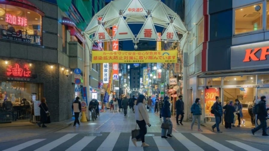 På bilden ser vi en gågata i en metropol, som går mellan höga hus. Gatan är upplyst av ett stort antal lyktor på kvällen och många människor rör sig längs den.