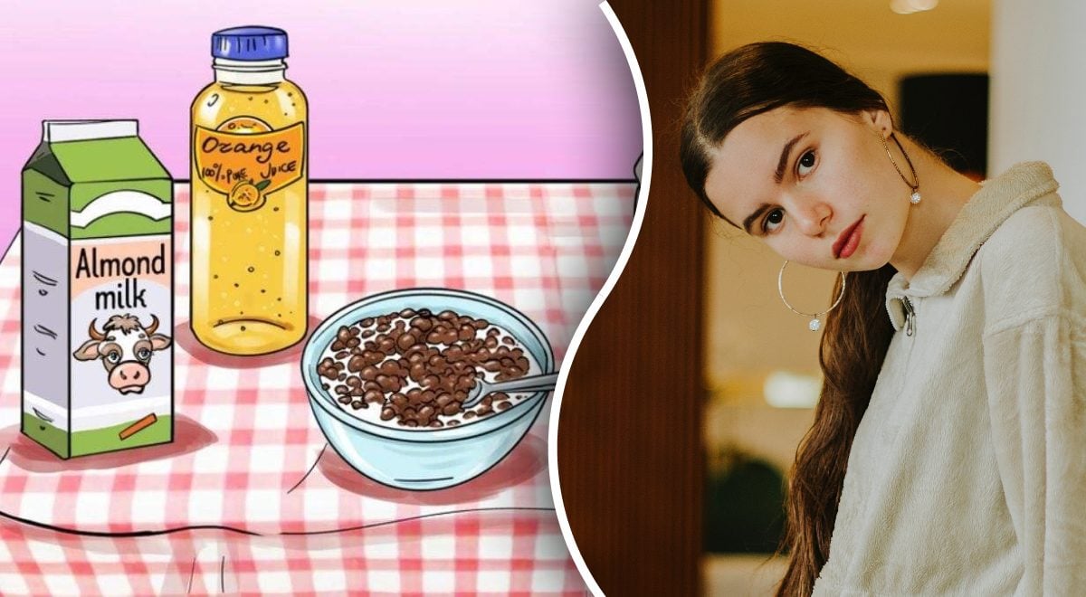 På bilden ser vi en skål med flingor dränkta i mjölk, ett frestande chokladkex, en flaska uppfriskande apelsinjuice och ett paket hälsosam mandelmjölk. Vid första anblicken är det inget misstag i bilden. Men det är just i det här fallet som man inte ska lita på sitt första intryck.