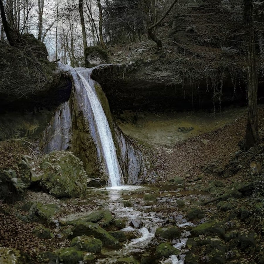På bilden ser vi ett skogslandskap med ett vattenfall. Vattnet faller ner på de mossbeklädda klipporna som ligger nedanför. Och färgskalan som ramar in skogen tyder på att bilden föreställer ett höstlandskap.