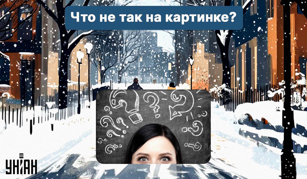 Nedan ser du en bild av en snöig stad, där ett par med ett litet barn i en barnvagn går omkring. Allt runt omkring är täckt av snö, men det är något som inte stämmer i den här bilden.
